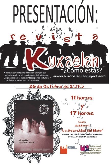La revista k’uxaelan es una producción que se comenzó en noviembre del año de 2009 por estudiantes de la Universidad Intercultural. Pretende revalorar el conocimiento de los pueblos originarios, difundiendo la la lengua materna partiendo de temas de actualidad. Conoce más en la presentación de mañana y de futuras presentaciones.