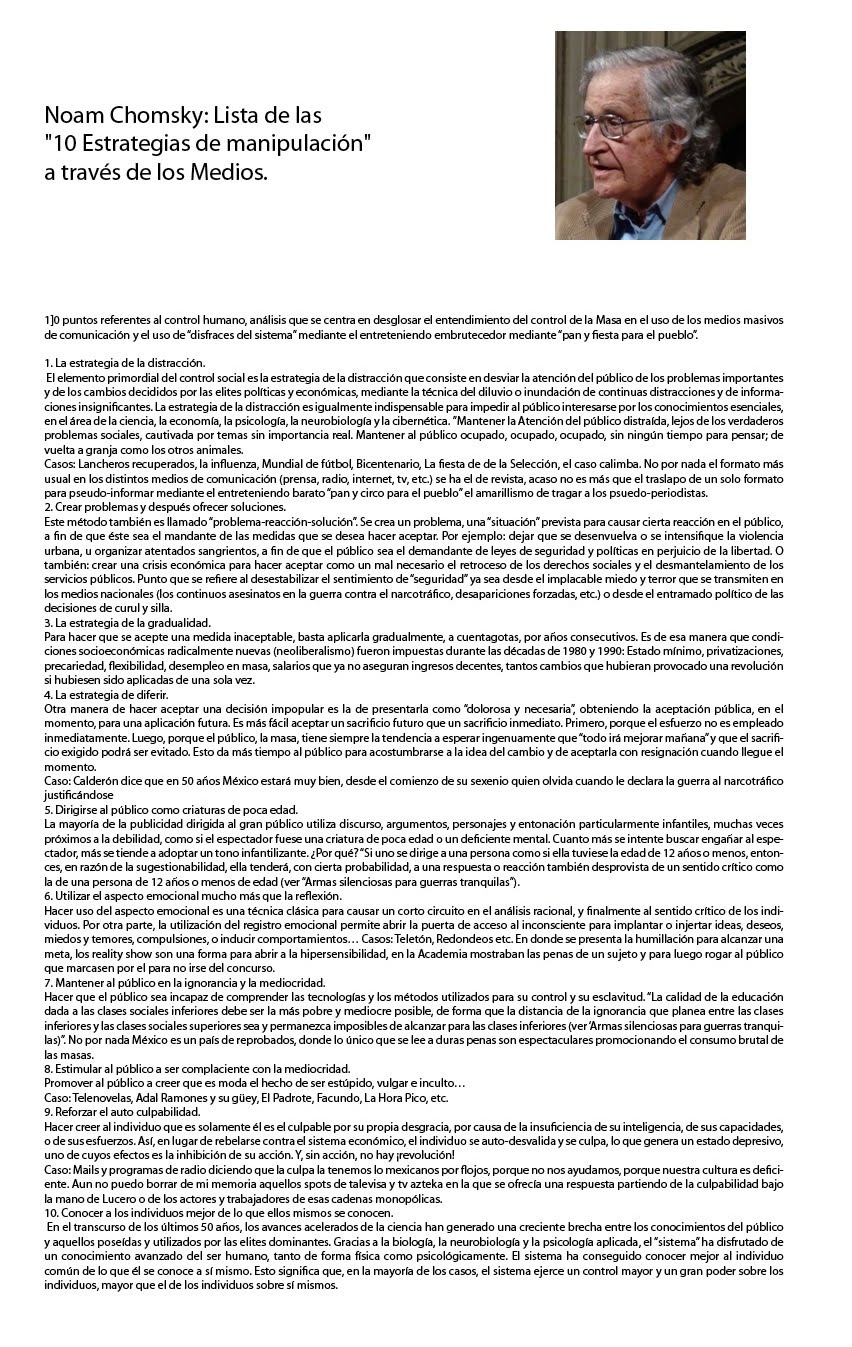 10 puntos referentes al control humano, análisis que se centra en desglosar el entendimiento del control de la Masa en el uso de los medios masivos de comunicación y el uso de “disfraces del sistema” mediante el entreteniendo embrutecedor mediante “pan y fiesta para el pueblo”.