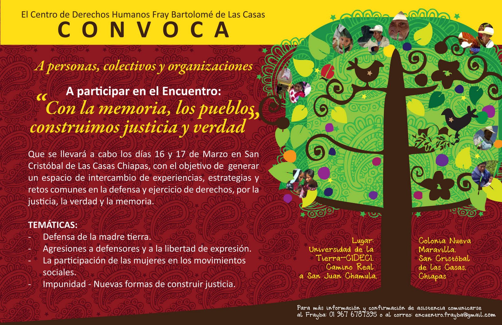 En punto de las nueve de la mañana, el moderador de la mesa, el compa Manuel, llamó a los presentes al encuentro “CON LA MEMORIA, LOS PUEBLOS CONSTRUIMOS JUSTICIA Y VERDAD” los días 16 y 17 de marzo, convocado por el Centro de Derechos Humanos fray Bartolomé de las Casas, con el fin de hacer conciencia sobre lo importante de hacer memoria de las luchas de los pueblos en resistencia.