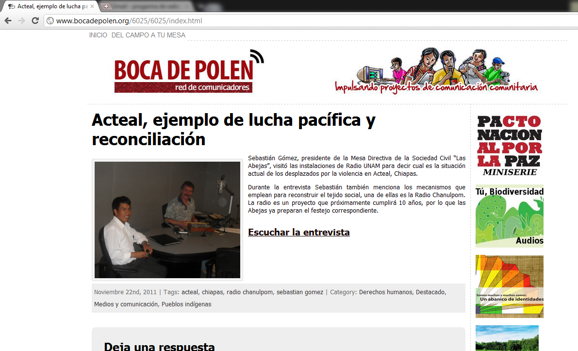 En la actualidad existen dos grupos que llevan el nombre de Las Abejas. Las originales, por así decirlo, son “La sociedad Civil Las Abejas de Acteal”(www.acteal.blogspot.com). El otro grupo es “Las Abejas A.C.” del cual es presidente Sebastián Gómez, el entrevistado. Ellos son los que están colaborando con el gobierno y los que tienen actualmente la radio Chanul Pom, apoyados por Boca de Polen.