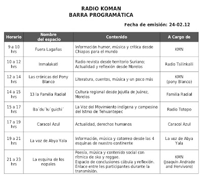 Hoy viernes escucha radio koman, esfuerzo en conjunto de diferentes colectivos y radios, uniendo el corazón y las ganas de compartir luchas. Saludos, complacencias, critica humor (negro) risas, lagrimas, coraje, alegria y compartir lo que pasa en el mundo sólo por las jornadas radiales.