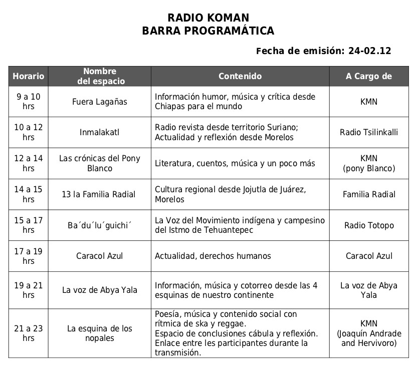 Hoy viernes escucha radio koman, esfuerzo en conjunto de diferentes colectivos y radios, uniendo el corazón y las ganas de compartir luchas. Saludos, complacencias, critica humor (negro) risas, lagrimas, coraje, alegria y compartir lo que pasa en el mundo sólo por las jornadas radiales.