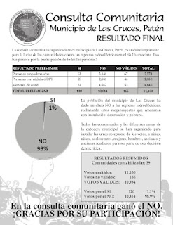 El resultado final de la consulta comunitaria en relación al asunto ¿Está de acuerdo con la ejecución de proyectos hidroeléctricos sobre el río Usumacinta en la jurisdicción territorial del municipio de Las Cruces?, es el siguiente: en total participaron 11,100 personas del municipio, de las cuales por el SI votaron 120 personas, por el NO votaron 10,814 personas, y 166 emitieron un voto no válido.
