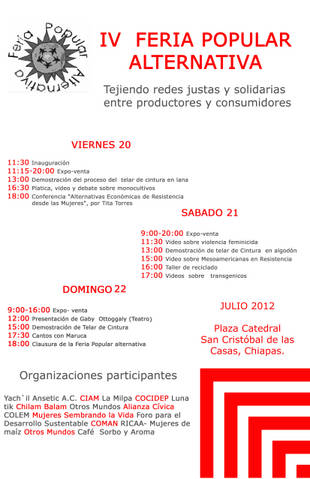 Desde este Viernes 20 al Domingo 22 se lleva a cabo en la Plaza de Catedral de San Cristobal de las Casas la IV Feria Popular Alternativa, en la que participan diversos grupos de productoras y productores independientes ofreciéndonos