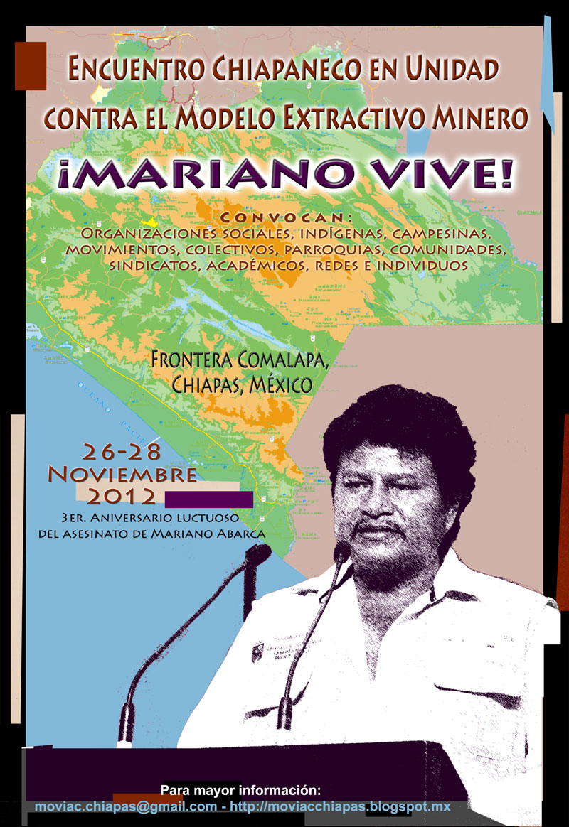 Desde Frontera Comalapa Chiapas Organizaciones Sociales, Campesinas, Movimientos, Colectivos, Parroquias y Comunidades, Sindicatos, Académicos, Redes e individuos unen sus voces, mentes y corazones para denunciar, analizar y compartir experiencias de lucha y resistencia frente al modelo extractivo minero, en el marco del tercer aniversario del asesinato de Mariano Abarca. Encuentro estatal con invitados de otros estados de la república y del mundo que busca generar estrategias que fortalezcan a los pueblos ante el despojo y las afectaciones ambientales y sociales que la minería provoca.