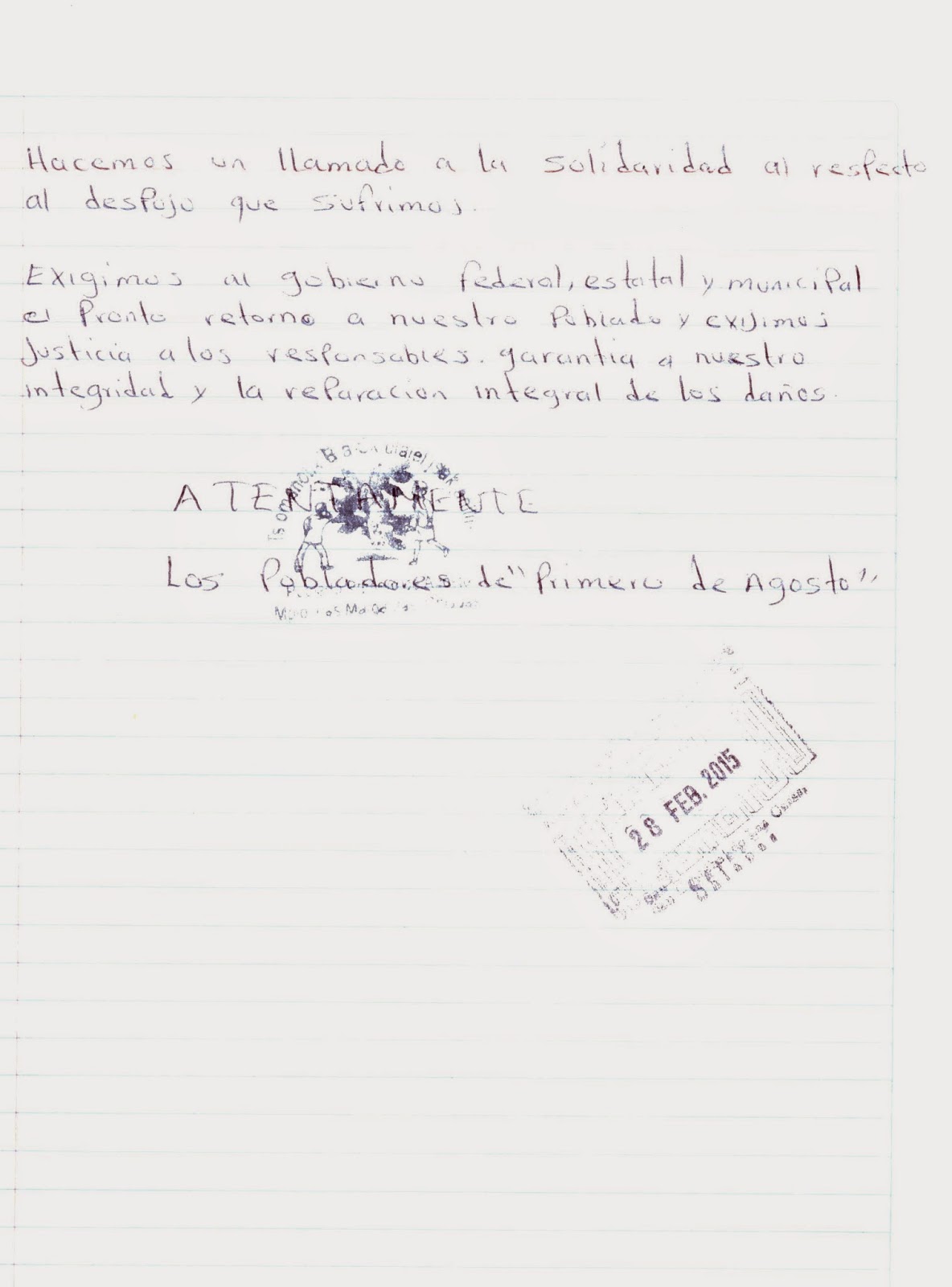 El pasado 23 de febrero de 2015, a las 8:00 am fuimos desplazados violentamente por ejidatarios del ejido Miguel Hidalgo, Las Margaritas, Chiapas, pertenecientes a la organización CIOAC-Histórica algunos vestidos de negro portando armas de alto poder y las mujeres con garrotes y machetes.