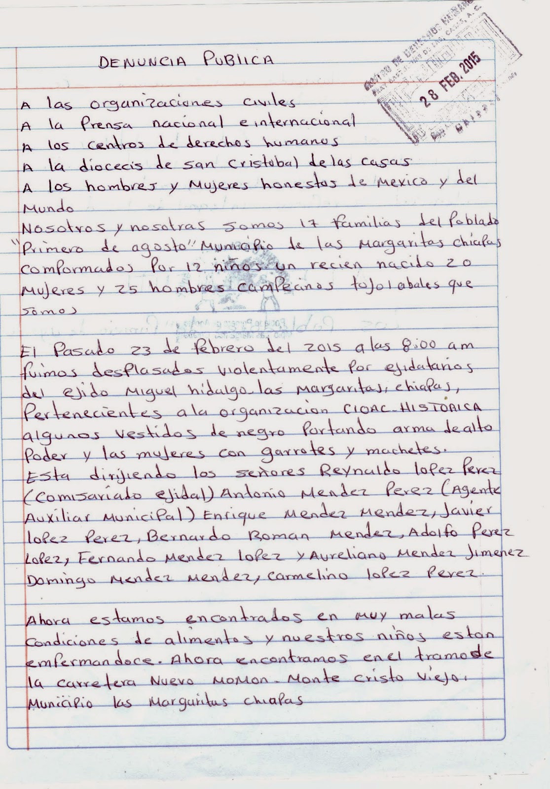 DENUNCIA PÚBLICA A las organizaciones civiles A la prensa nacional e internacional A los centros de derechos humanos A la diócesis de San Cristóbal de...