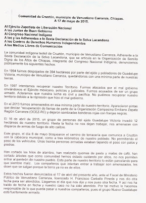 Comunidad de Crustón, municipio de Venustiano Carranza, Chiapas. A 17 de mayo de 2015 Al Ejército Zapatista de Liberación Nacional A las Juntas de Buen...