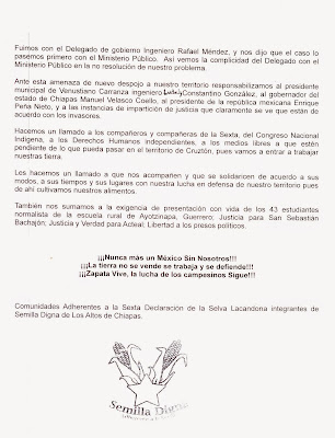 Ante esta amenaza de nuevo despojo a nuestro territorio responsabilizamos al presidente municipal de Venustiano Carranza ingeniero Constantino González, al gobernador del estado de Chiapas Manuel Velasco Coello, al presidente de la república mexicana Enrique Peña Nieto, y a las instancias de impartición de justicia que claramente se ve que están de acuerdo con los invasores.
