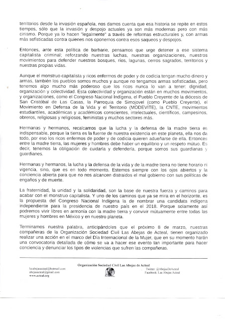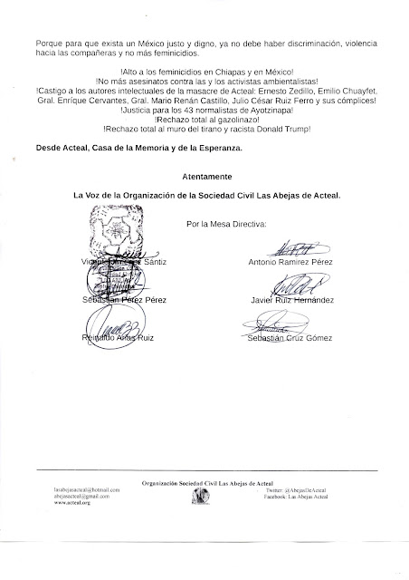 Nosotras y nosotros quienes somos la Organización Sociedad Civil Las Abejas de Acteal y junto con las y los sobrevivientes y víctimas de la masacre de Acteal, vemos con mucha tristeza e indignación que el mal gobierno de México representado por Enríque Peña Nieto, siga violando los derechos humanos de los mexicanos de diferentes maneras y sobre todo su servilismo ante el sistema capitalista neoliberal, un ejemplo claro es su subordinación ante el gobierno del tirano y racista Donald Trump.