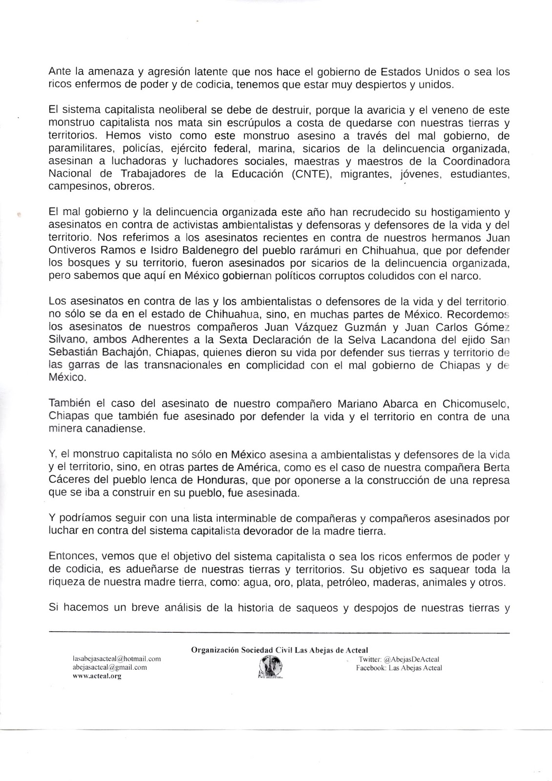 Nosotras y nosotros quienes somos la Organización Sociedad Civil Las Abejas de Acteal y junto con las y los sobrevivientes y víctimas de la masacre de Acteal, vemos con mucha tristeza e indignación que el mal gobierno de México representado por Enríque Peña Nieto, siga violando los derechos humanos de los mexicanos de diferentes maneras y sobre todo su servilismo ante el sistema capitalista neoliberal, un ejemplo claro es su subordinación ante el gobierno del tirano y racista Donald Trump.