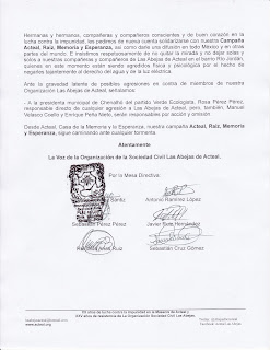 Ante la gravedad latente de posibles agresiones en contra de miembros de nuestra Organización Las Abejas de Acteal, señalamos: