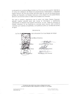 El día de hoy hemos enviado una carta al señor Léo Heller Relator Especial sobre el derecho humano al agua potable y al saneamiento, para que visite nuestras compañeras y compañeros del barrio Río Jordán colonia Miguel Utrilla Los Chorros integrantes de nuestra Organización Sociedad Civil Las Abejas y, conozca de primera mano la situación en la que se encuentran ante la violación del derecho al acceso al agua como una forma de presión para restar fuerza a nuestra resistencia y autonomía.